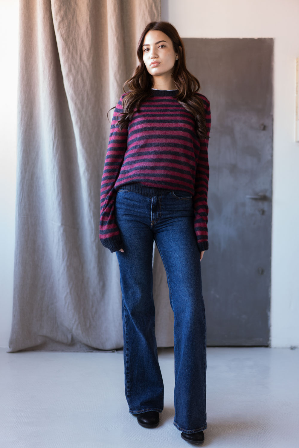 Maglia girocollo a righe, leggera e morbida, definita da delicati elastici ai polsi e alla vita che ne valorizzano la caduta naturale. Un modello essenziale ma d’impatto, capace di aggiungere carattere a ogni look mantenendo un’eleganza sobria e senza tempo. Realizzata interamente a km0 nel miglior laboratorio artigianale della nostra zona, esprime la cura, la tradizione e l’autentica qualità della nostra manifattura locale. I filati selezionati rendono questo girocollo soffice, confortevole e piacevole da indossare in ogni occasione. 50% Mohair Superkid 32% Poliammide 18% Lana Merino Extra Fine